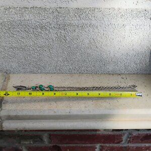 Elevate your style with this artisan handmade necklace featuring turquoise cabochons from the Kingman mine and sterling silver feathers on an adjustable lariat chain. Perfect for any occasion. Measures up to 20" long, with an additional 2" for the drop. Weighs 24.2 grams.
