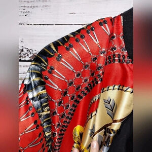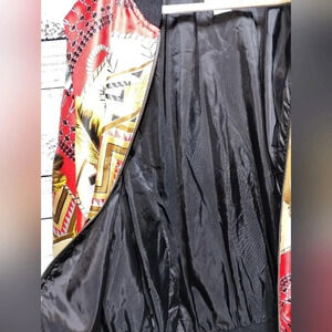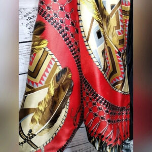 Get ready to make a bold statement with this Southwest Pizazz Native Feather Design Bomber Jacket! Measuring 26" from armpit to armpit and 25" in length, this 80's lined jacket is a true gem. Despite minimal pilling on the sleeves, it remains in great used condition. The standout feature of this jacket is its artful design, showcasing bright pops of color and native American feathers in a stunning gold, cream, brown, black and red circular pattern on both the front and back. Embrace the spirit of the Southwest with this unique and eye-catching bomber jacket!