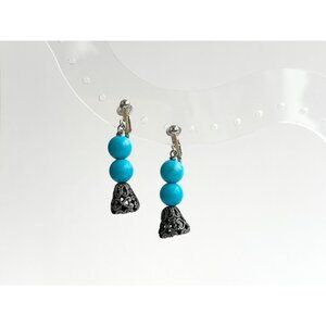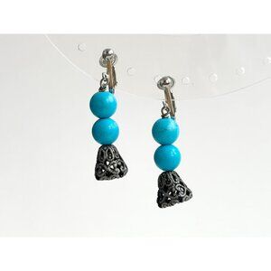Silver toned vintage faux turquoise dangle earrings. Clip on style. The bottom silver section is kind of in the shape of a volcano, it's hollow inside rendering the earrings comfortable and lightweight. The stones look like faux turquoise but the closest in appearance to a real stone is sleeping beauty turquoise. Comfortable for all day wear, even if you have pierced ears. Lovely pair!