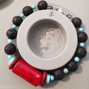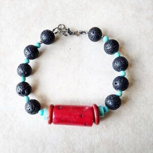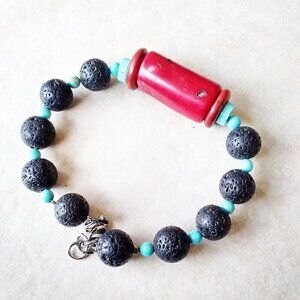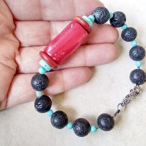 Southwest Vibes! Red Coral + Turquoise Howlite + Black Lava Rock Bracelet 7-8"