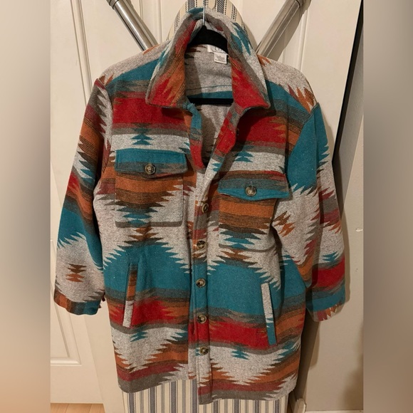 Stylish jacket with a vibrant Southwestern pattern. Features a mix of teal, red, and brown colors. Button-up front with two chest pockets. This shacket is so cute!!
