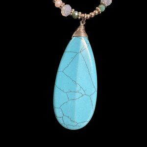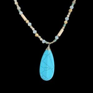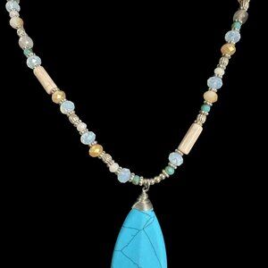Southwestern Faux Turquoise Wire Wrapped Pendant Beaded Necklace 32" Adjustable