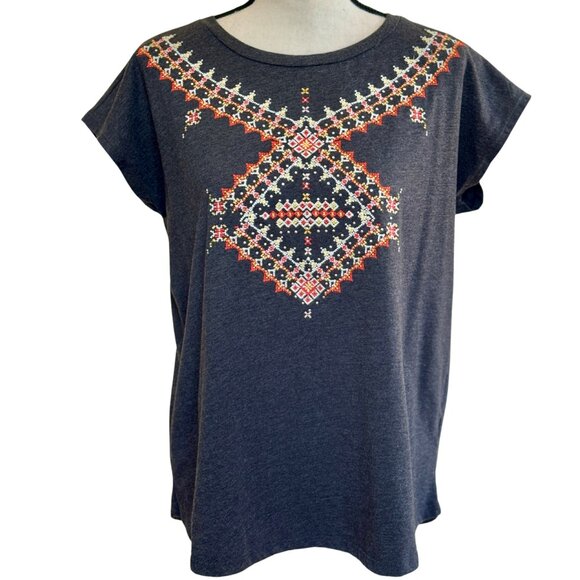 Bohemian, Boho Chic, Tribal, Embroidered, Folk Art, Southwestern, Rustic, Earth Tones, Festival, Casual, Everyday Wear, Comfy, Relaxed Fit, Cap Sleeve, Tee Shirt, Top, Blouse, Pullover, Crew Neck, Geometric, Stitchwork, Cottagecore, Artisan, Unique, Indie, Hippie, Free Spirit, Artsy, Eclectic, Summer, Spring, Fall, Travel, Vacation, Lightweight, Soft Fabric, Rayon Blend, Dark Gray, Neutral, Versatile, Layering, Weekend Wear, Resort Wear, Boho Style, Vintage Inspired, Modern Boho
