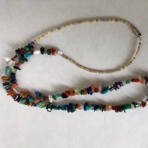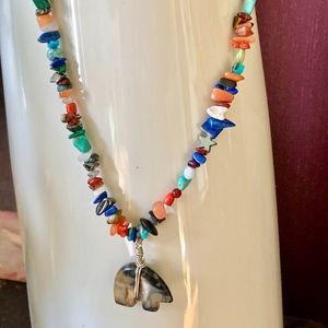 Carved Jasper bear pendant necklace strung with small stones, shell and coral 28".