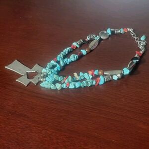 Southwestern Navajo Turquoise Double Strand Necklace Pewter Ankh Pendant Heart