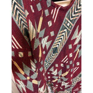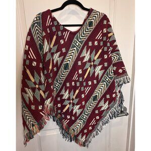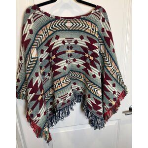 Southwestern Pattern Knit Poncho With Fringe Hem