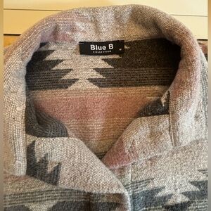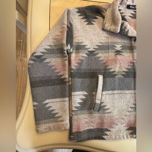 Stylish button-up jacket with a Southwestern pattern. Features shades of gray and pink. Perfect for casual wear. Oversized, no rips or stains. Non-smoking home.