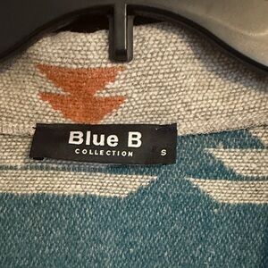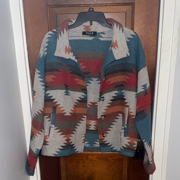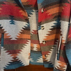 Shacket with a bold southwestern pattern. Features shades of teal, red, and brown. Perfect for a statement look. Oversized could fit medium