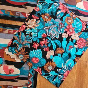 Colorful 2 Sided placemats with painted clay pots and designs in turquoise, tan, brown, orange and black on one side and a