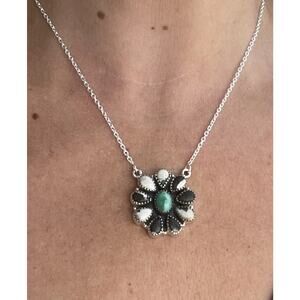 This bold and playful handmade white buffalo turquoise/bluish green turquoise cluster necklace features a vibrant mix of black,white and green stones set in sterling silver. Each round stone is individually bezel-set in a crown-style setting and arranged in a flower-like formation, offering a standout look with Southwestern flair.