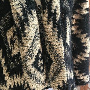 Black and tan long Southwestern cardigan of polymide/acrylic and wool blanket pattern; fuzzy black and flat tan; shawl collar and waterfall front; asymmetrical hem; sweater 32" long; sleeves 24" long; hand wash.