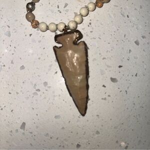 Long gold accented arrowhead Bohemian/southwestern style necklace with neutral colored beads 18” drop (36” total)