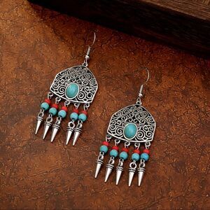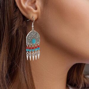 Gorgeous pierced silver tone turquoise southwestern bohemian native style dangle earrings with French hooks and a beautiful design that encompasses faux turquoise and coral in a lace style with dangling spikes. Beautiful addition to any wardrobe.