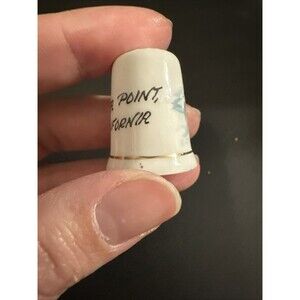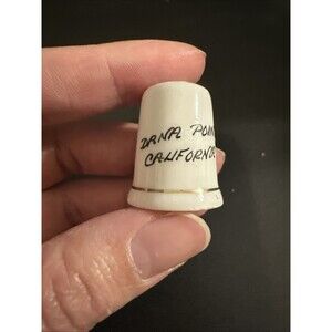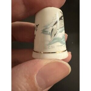 The product is a porcelain thimble featuring a dolphin design from Dana Point, California. This collectible item serves a practical purpose for sewing enthusiasts while also showcasing a unique and charming design inspired by the marine life of the area. Porcelain's durability and detailed craftsmanship make it a suitable material for creating a lasting and decorative souvenir piece.