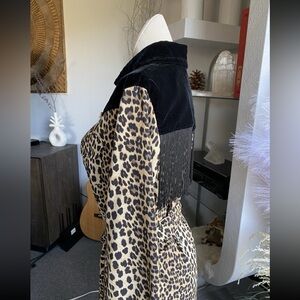 Stylish leopard print dress with long sleeves and a tie waist. Features a black velvet collar with fringe and cuffs.