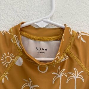 Shop Sova infant swim top in size 0-6 months! Good, used condition for swim. A cute golden color with sunshine, ocean and palm tree print.