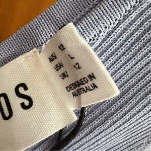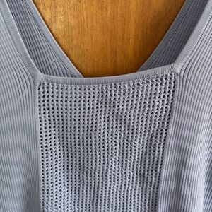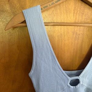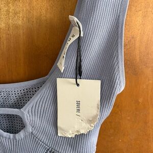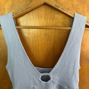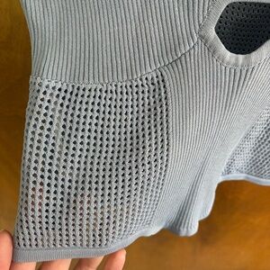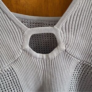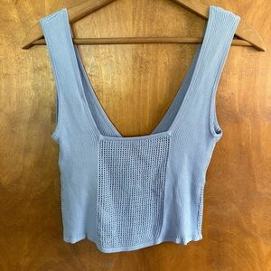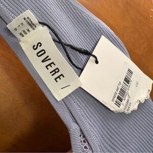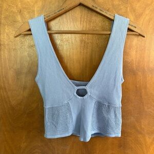 Gorgeous Sovere pastel periwinkle blue Intrepid open knit crop top with keyhole front in a size large. Sold on Revolve. NWT, new with tags. It features, a sheer side panels, an angled front, wide straps, a nylon blend, & an open front.