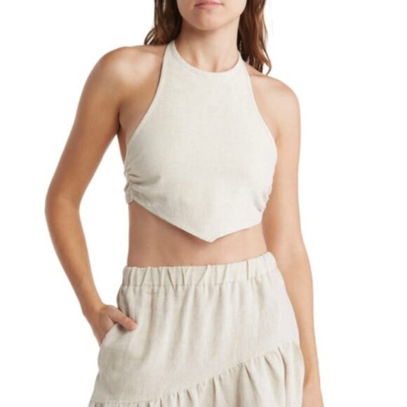 A handkerchief hem adds on-trend flare to a halter crop top that is cut from a breezy linen blend that will keep you cool all-day.