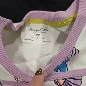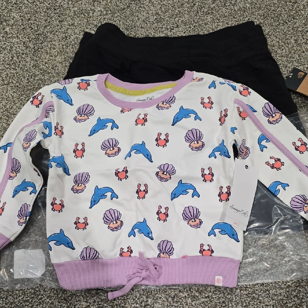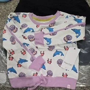 Adorable sweater featuring dolphins, crabs, and seashells. Perfect for a playful look.