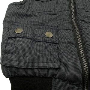 Sovereign Code Toddler Holloran Vest Navy Checked with Black Trim - cute little quilted vest, 4 snap pockets, sherpa lined, front zipper, decorative tabs on either side at waist. Pre-owned, great condition. The vest is a navy or dark blue and the lines that make the check pattern are black. The two tab snaps show wear.