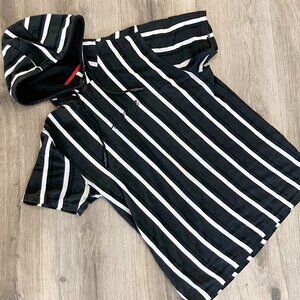 From Sovereign State "New York 1994", known for its urban streetwear aesthetic. Black with evenly spaced, white vertical stripes, a hood with drawstrings, and short sleeves. "Savage" is embroidered in black cursive on the chest.