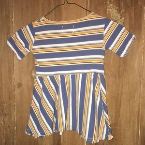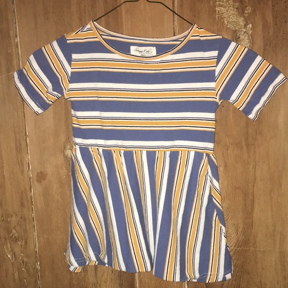 Colonial blue, dark yellow and white striped. Short sleeve, pullover.