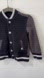 Stylish black and grey varsity jacket with white accents. Toddler, jacket, varsity jacket, buttons, button up, button down, pockets, stylish, fashion, preppy.