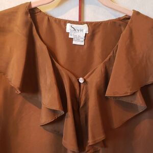 Brown sleeveless blouse with a ruffled V-neckline. It's made of a lightweight, silky fabric. It features a ruffle detail and a simple, sleeveless design. A single button closure is present at the center of the ruffle.