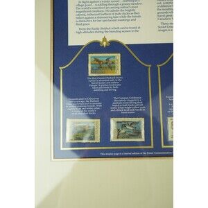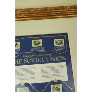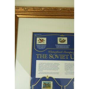 Add a rare and unique addition to your stamp collection with this gold-framed display page of Soviet Union Waterfowl stamps from 1989-1991. These stamps feature beautiful and detailed depictions of birds, making them a great addition for any bird or stamp enthusiast. The stamps are in mint never hinged condition, ensuring their quality and value. This display page is a must-have for collectors of Russian and Soviet Union stamps and adds a touch of elegance to any collection.
