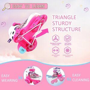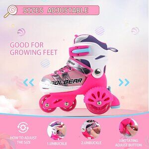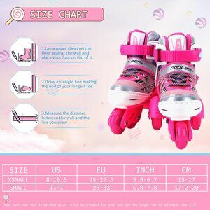 These roller skates Small fits US little kids shoe size 10-13; Medium: fits US big kids shoe size 13-3. The kids adjustable skates size can be adjusted. Perfect for growing children. Kids can adjust by themselves easily via press of a button, and you just need to choose according to the picture size a pair of suitable girls skates.