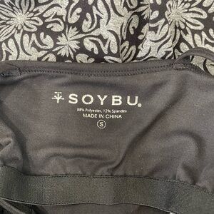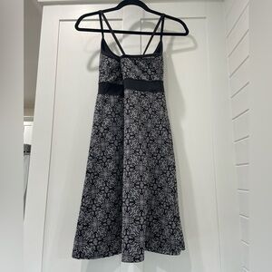 This black and gray floral print dress features a built in bra and lots of stretch.