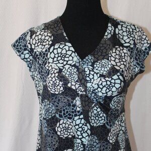 Fantastic navy blue and white floral pullover short sleeve active style dress! Lots of stretch. Fit and flare style that is very flattering. Roughly knee length depending upon height! Perfect for active and casual wear.