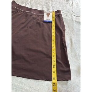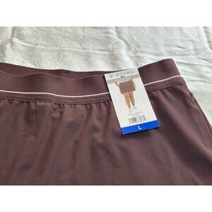 New with tags Soybu Women's Regular Sport skort in a deep purple/brown color, size Large. This activewear skort features a comfortable stretch elastic waistband with subtle white trim and integrated inner shorts for enhanced coverage during activities. The outer shell is made from 79% nylon and 21% spandex, while the inner short is 92% polyester and 8% spandex, providing flexibility and support. It includes secure zip pockets, making it practical for sports or casual wear. This item is designed for comfort and functionality, perfect for active lifestyles. 2015-1