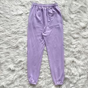 Rare lavender Sp5der sweatpants with black & white “sp5der!” logo and “heroes the slime” slogan down the leg. Sprinkled with colorful star graphics for an eye-catching look. Elastic waist + cuffs for a comfortable fit. Perfect lounge or streetwear flex.