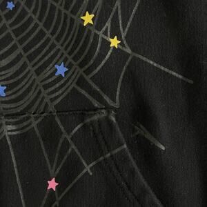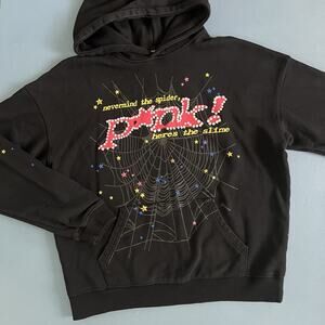 This luxe black hoodie features a striking starry pattern that adds a unique touch to its casual streetwear style. Classic Spider slime slogan. The bold pink graphic design on the front enhances its modern aesthetic, making it a standout piece for any wardrobe.