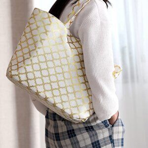 This stylish tote bag features a chic gold and cream / off white pattern, perfect for any occasion. Its elegant design makes it a versatile accessory for your wardrobe. Roomy size for carrying all your necessities to work, the pool or beach, or anywhere you need to tote stuff. Perfect for everyday use.