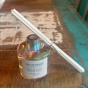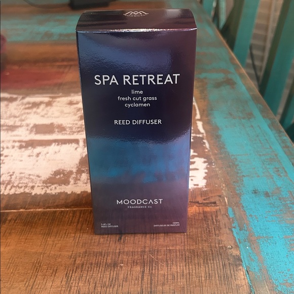 Spa Retreat reed diffuser with lime, fresh cut grass, and cyclamen scent. Elegant packaging in a deep purple hue.