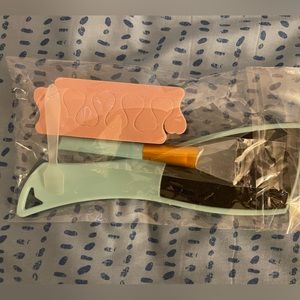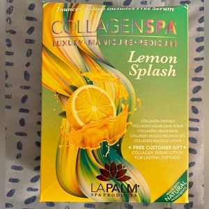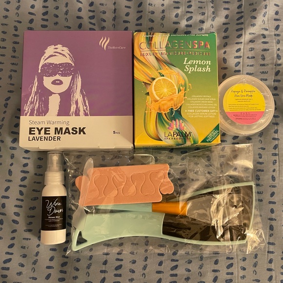 At home spa set perfect or nights if relaxation. Includes a mani/pedi 6 step pamper package with accessories, 5 lavender eye masks, a shower mist to set the mood, and an exfoliating gel mask.