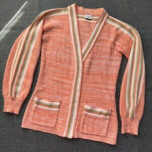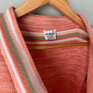 Vintage 1970s era space-dyed knit cardigan in sherbert orange/peachy salmon color with stripes.
