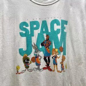 This Space Jam LeBron James shirt is an adult large white tee featuring a graphic logo from the movie "A New Legacy." Made of cotton knit fabric with a crew neck and short sleeves, this regular fit t-shirt is machine washable and tagless for easy care. It showcases various characters like Speedy Gonzales, Bugs Bunny, Tweety Bird, Daffy Duck, and LeBron James, perfect for fans of the 90s movie franchise.