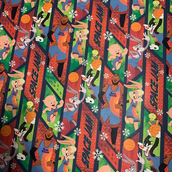 70 square ft. Space Jam Wrapping Paper. Comes without roll for easier and lighter shipping. Will be well protected in shipping, to arrive in ready to wrap condition. Great for Christmas or birthdays!