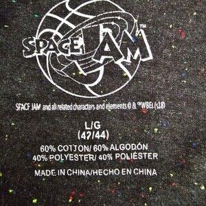 Space Jams short sleeve graphic t-shirt in a size L. Black tee, multi-colored speckles throughout. Graphic with Bugs Bunny, Daffy Duck, Tasmanian Devil, Sylvester, and Coyote. Graphic has some smudging on the "M" but I believe it is by design from the manufacturer. No other noted flaws.