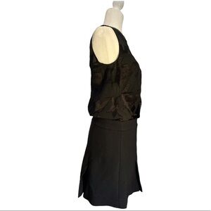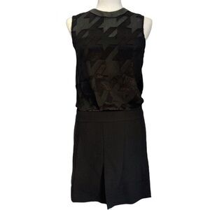 Space Style Concept Blouson Pleated Mini Dress featuring a textured Houndstooth Top, Sheer Yoke, Leather Neckline. Keyhole Back with double Button Closure.