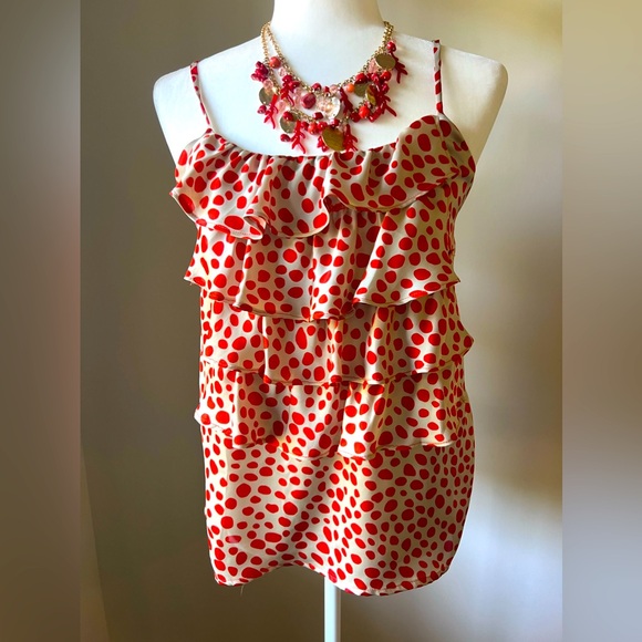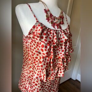 Fun and Flirty Adjustable Spaghetti Strap Orange and Cream Dot Pattern Silky Ruffle Tank- Small