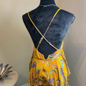 Spaghetti strap romper. Tropical floral themed fabric. Straps are adjustable. Hidden zipper enclosure in the back. Tie on the waistband, ties in the back. Double ruffle lower hemline.