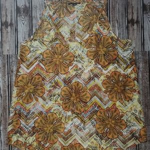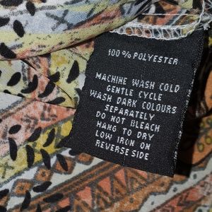 This shirt has a mix blend of flowers and zigzags as the design. The shirt also has areas in the design that is faded in. Which is part of the actual design. It's made of 100% polyester. This shirt has a mixture of colors, orange, yellow, light blue, white and black. Good condition no flaws.