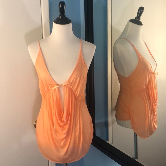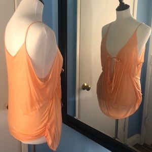 Orange sherbet in color. Front ribbon tie, gathered detailing, soft-thin cotton T-shirt.