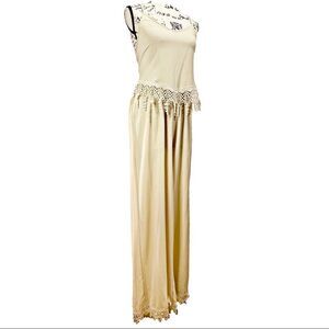 NEW summer sensation collection! V-neck sleeveless, wide-leg romper outfit! White crochet trim in a cream color. Flirty spaghetti strap bandana top with long wide-legged pants detailed with white crochet trim.