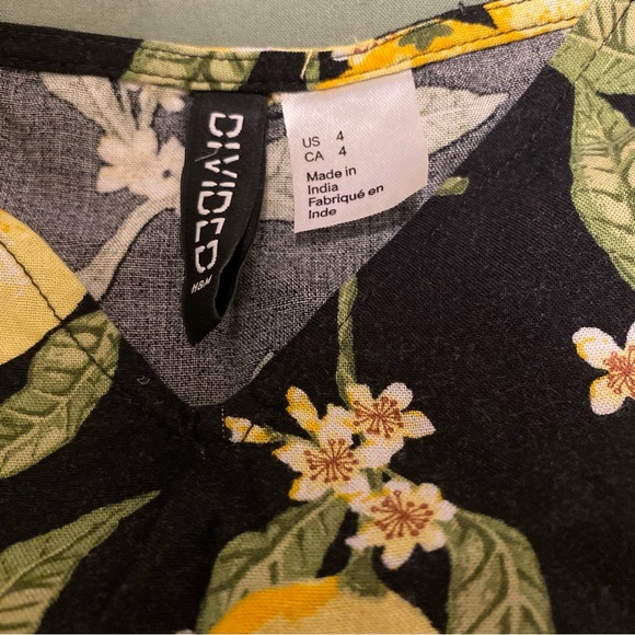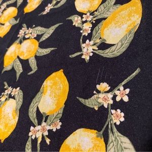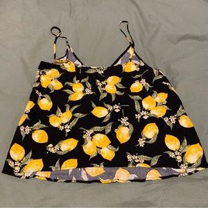 Black spaghetti strap with lemon print, and adjustable straps loose fitting, pre loved with lots of life. Has a pull, shown in picture reflected in price