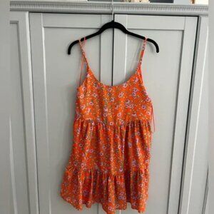 Spaghetti strap, bright orange, purple and blue floral sundress